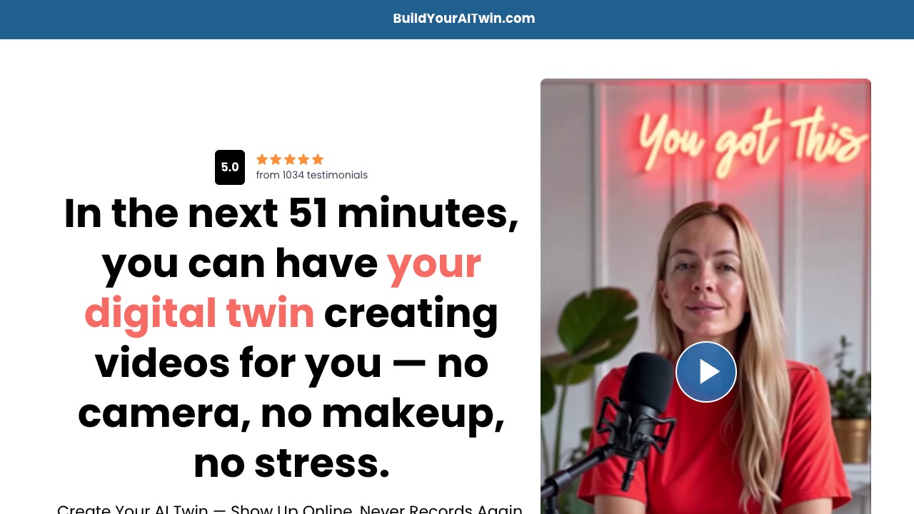 Build Your AI Twin is our go-to tool for creating realistic AI avatars that look and sound just like us. We use it to produce on-brand videos, trainings, and content without having to be on camera. It saves hours of filming and editing while keeping our message personal, consistent, and professional.